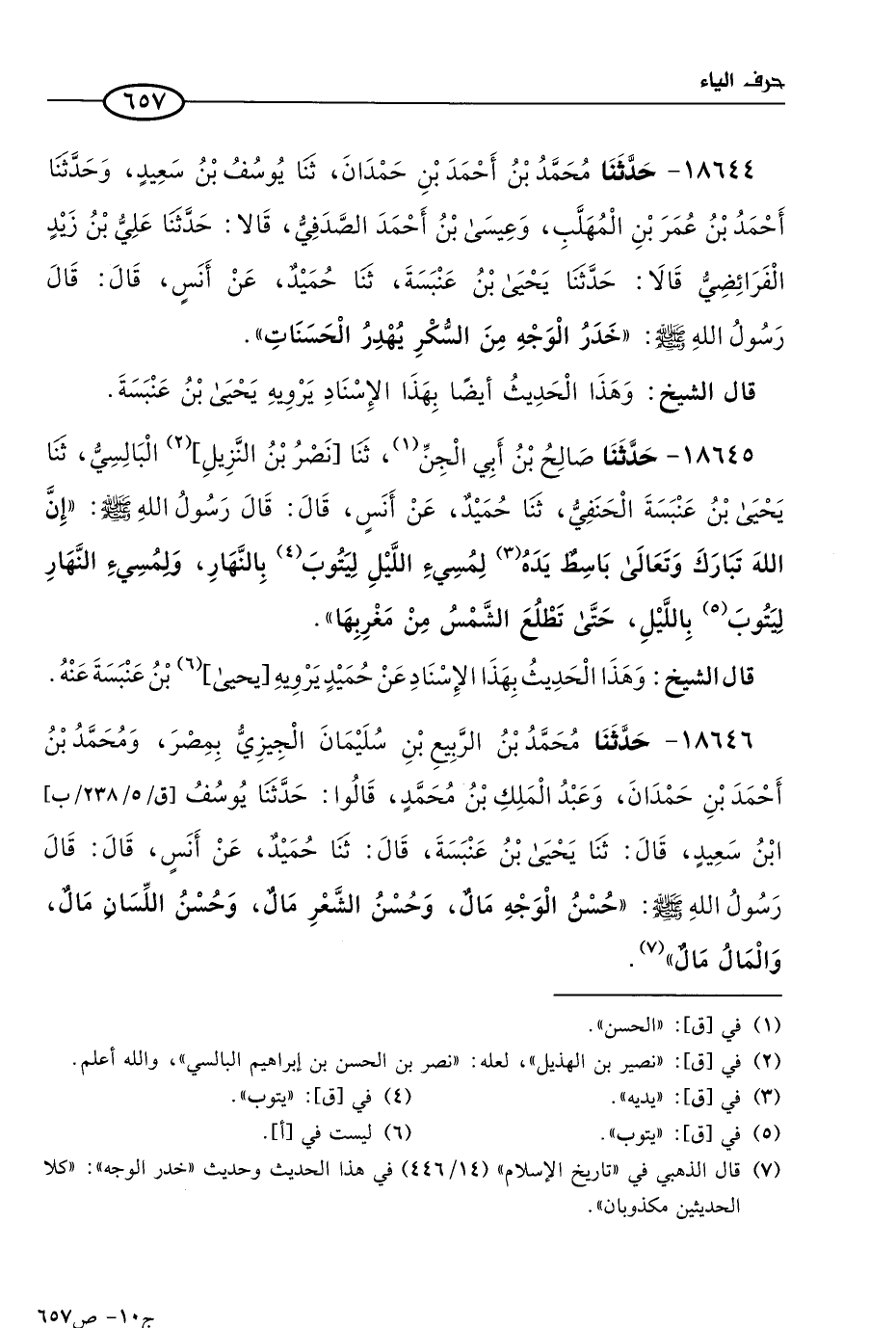 18644 - حَدثنا مُحمد بن أحمد بن حمدان، حَدثنا يوسف بن سعيد (ح) وحدثنا أحمد بن عُمر بن المهلب، وعيسى بن أحمد الصدفي، قالا: حَدثنا علي بن زيد الفرائضي، قالا: حَدثنا يحيى بن عنبسة، حَدثنا حميد، عن أَنَس، قال: قال رسول الله صَلى الله عَليه وسَلم: خدر الوجه من السكر يهدر الحسنات.