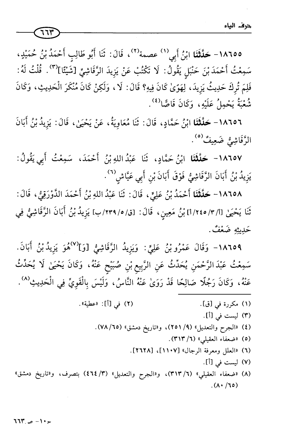 18657 - حَدثنا ابن حماد، حَدثنا عَبد الله بن أحمد، سمعت أبى يقول: يزيد بن أَبَان الرقاشي فوق أَبَان بن أبي عياش.