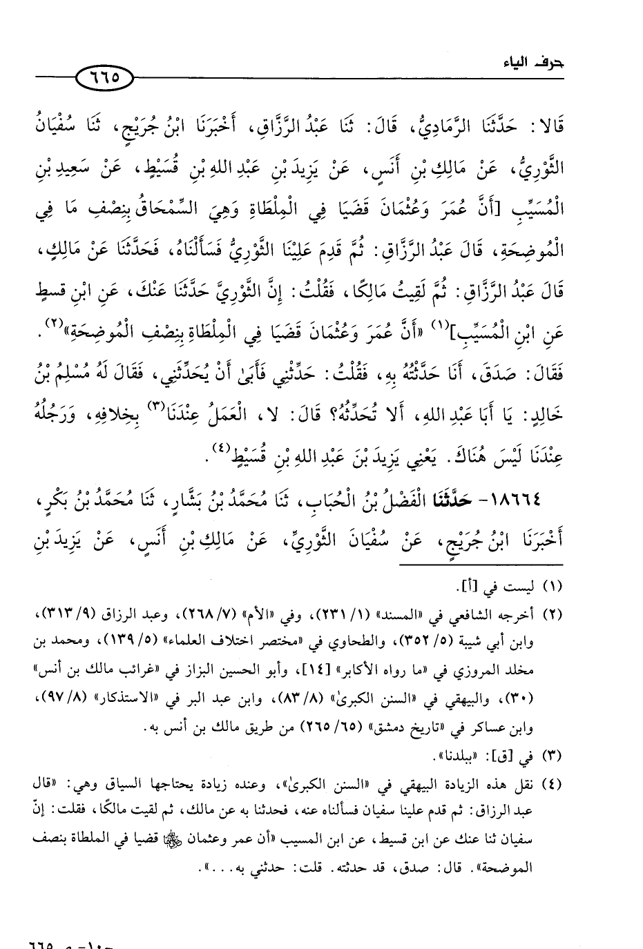 18664 - حَدثنا الفضل بن الحباب، حَدثنا مُحمد بن بشار، حَدثنا مُحمد بن بكر، أخبرنا ابن جُرَيج، عن سفيان الثَّوري، عن مالك بن أنس، عن يزيد بن عَبد الله بن قسيط، عن سعيد بن المُسَيب، عن عُمر، وعثمان؛ أنهما قضيا في الملطاة بنصف عقل الموضحة، وهي السمحاق.