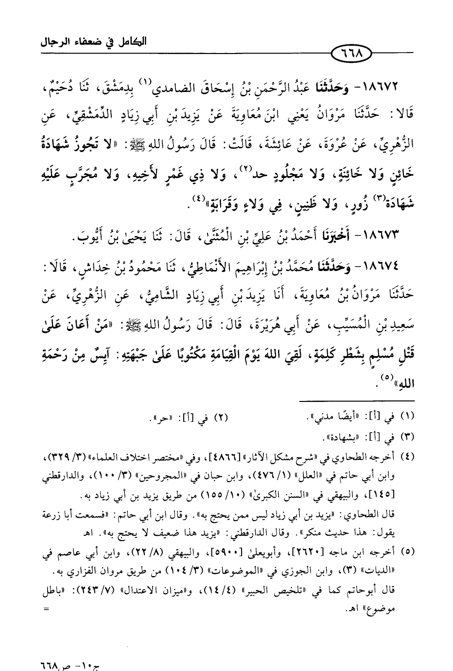 (1) تحرف في طبعتي العلمية والرشد إلى: «يزيد [بن] مروان الفزاري»، والروايتان يرويهما مروان بن معاوية الفزاري، عن يزيد بن أبي زياد الشامي الدمشقي صاحب الترجمة.