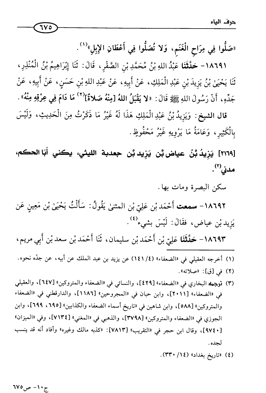 18693 - حَدثنا علي بن أحمد بن سليمان، حَدثنا أحمد بن سعد بن أبي مريم، قال: سمعتُ يحيى بن مَعين يقول: يزيد بن عياض بن جعدبة ليس بشَيءٍ، ولا يكتب حديثه.