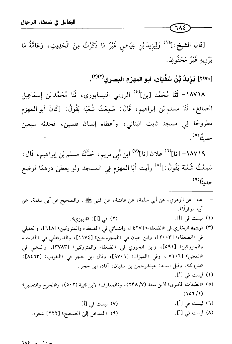 18718 - حَدثنا مُحمد بن الرومي النيسابوري، حَدثنا مُحمد بن إسماعيل الصائغ، حَدثنا مسلم بن إبراهيم، قال: سمعتُ شُعبَة يقول: كان أَبو المهزم مطروحا في مسجد ثابت البناني، لو أعطاه (1) إنسان فلسين، فحدثه سبعين حديثا.