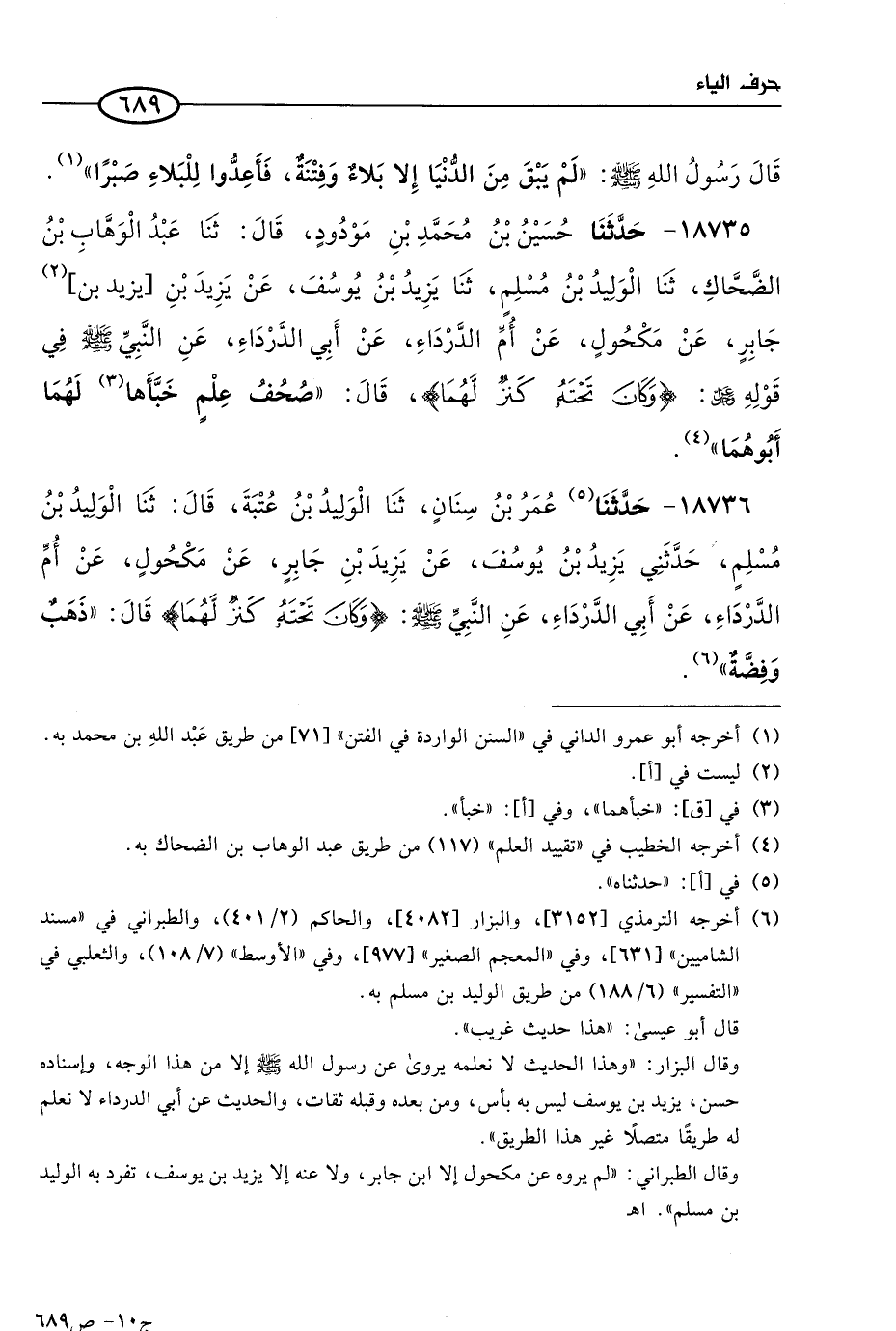 18735 - حَدثنا حسين بن مُحمد بن مودود، قال: حَدثنا عَبد الوهاب بن الضحاك، حَدثنا الوليد بن مسلم، حَدثنا يزيد بن يوسف، عن يزيد بن يزيد بن جابر، عن مكحول، عن أم الدرداء، عن أبي الدرداء، عن النبي صَلى الله عَليه وسلم؛ في قوله عَزّ وجَلَّ: {وكان تحته كنز لهما} قال: صحف علم، خبأها لهما أبوهما.