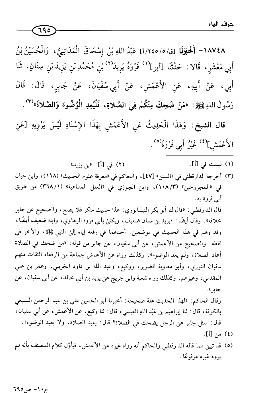18748 - أخبرنا عَبد الله بن إسحاق المدائني، والحُسَين بن أبي معشر، قالا: حَدثنا أبو فروة يزيد بن مُحمد بن يزيد بن سنان، حَدثنا أبى، عن أبيه، عن الأَعمَش، عن أبي سُفيان، عن جابر، قال: قال رسول الله صَلى الله عَليه وسَلم: من ضحك منكم في الصلاة فليعد الوضوء والصلاة.