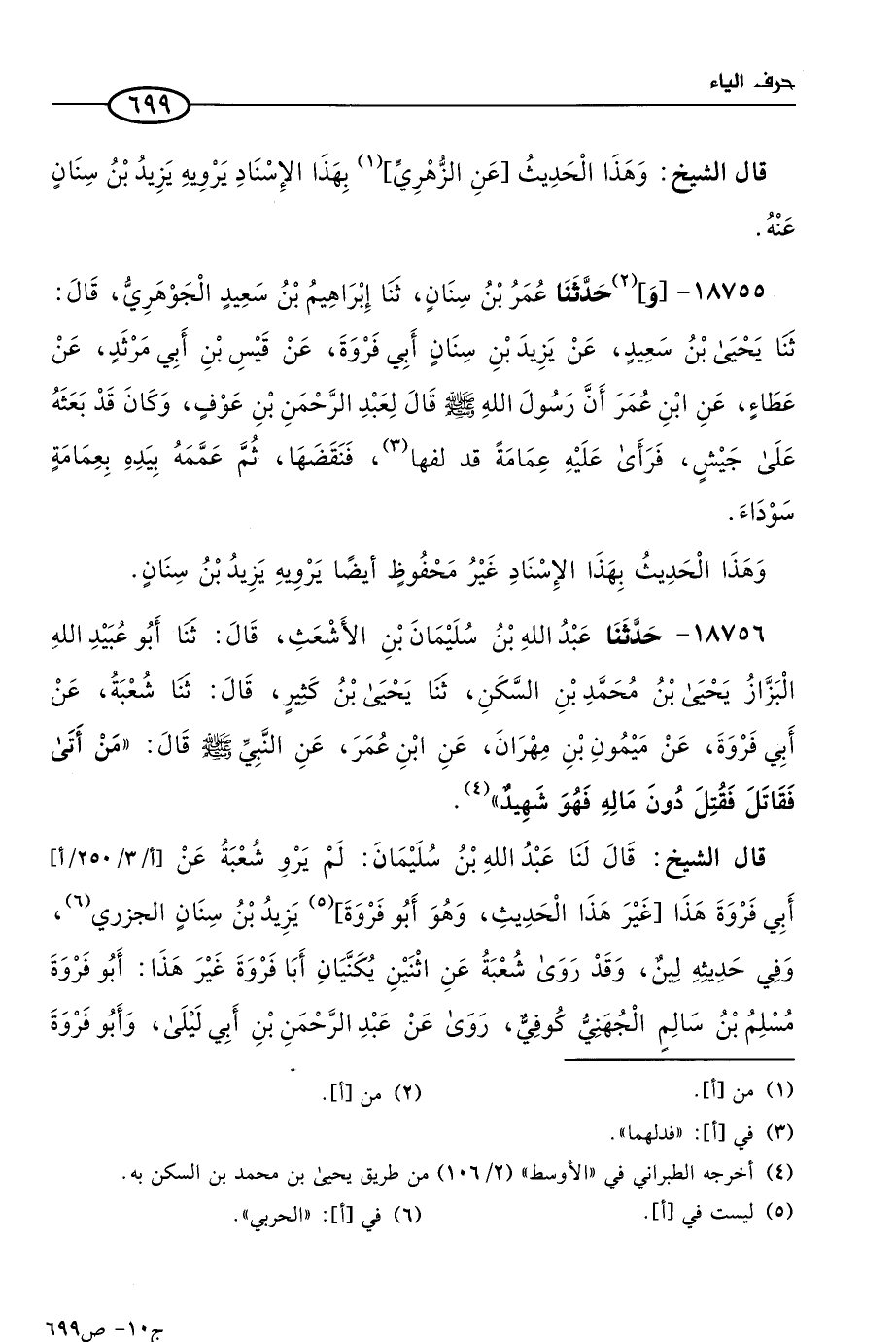18756 - حَدثنا عَبد الله بن سليمان بن الأشعث، قال: حَدثنا أَبو عُبيد الله البزاز (1) يحيى بن مُحمد بن السكن، حَدثنا يحيى بن كثير، قال: حَدثنا شُعبَة، عن أبي فروة، عن ميمون بن مهران، عن ابن عُمر، عن النبي صَلى الله عَليه وسَلم قال: من أتي فقاتل فقتل دون ماله فهو شهيد.