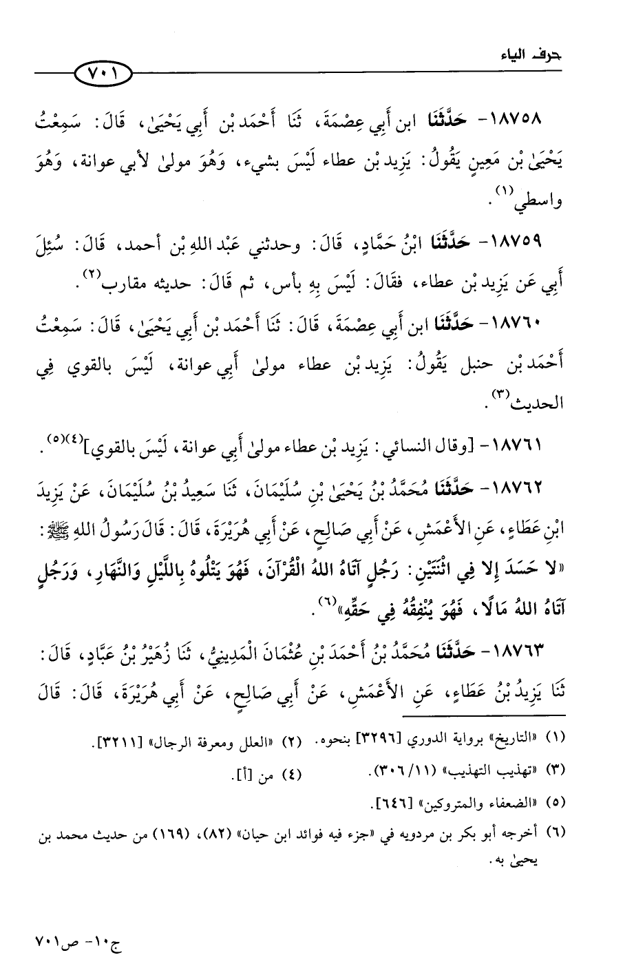 18760 - حَدثنا ابن أبي عصمة، قال: حَدثنا أحمد بن أبي يحيى، قال: سمعتُ أحمد بن حنبل يقول: يزيد بن عطاء مولى أبى عَوَانة، ليس بالقوي في الحديث.
