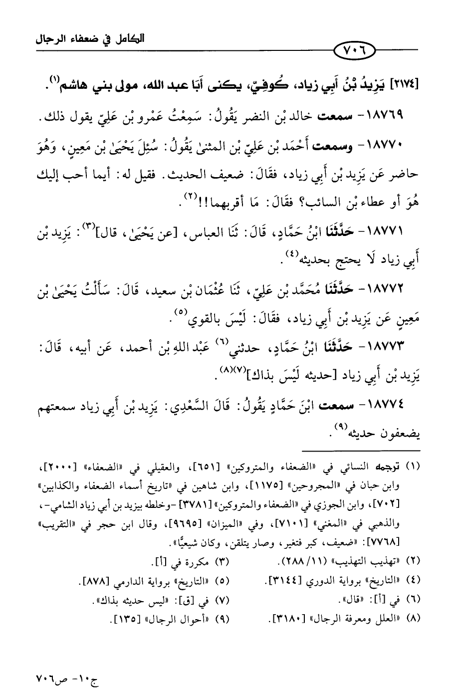 18770 - وسمعت أحمد بن على بن المثنى، يقول: سئل يحيى بن مَعين، وهو حاضر، عن يزيد بن أبي زياد، فقال: ضَعيف الحديث. فقيل له: أيما أحب إليك هو، أو عطاء بن السائب؟ فقال: ما أقربهما.