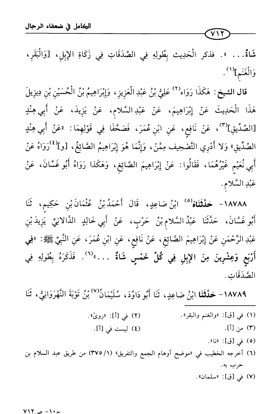 18788 - حدثناه ابن صاعد، قال أحمد بن عثمان بن حكيم: حَدثنا أَبو غسان، حَدثنا عَبد السلام بن حرب، عن أبي خالد الدالاني يزيد بن عَبد الرحمن، عن إبراهيم الصائغ، عن نافع، عن ابن عُمر، عن النبي صَلى الله عَليه وسلم؛ في أربع وعشرين من الإبل، في كل خمس شاة، فذكره بطوله في الصدقات.