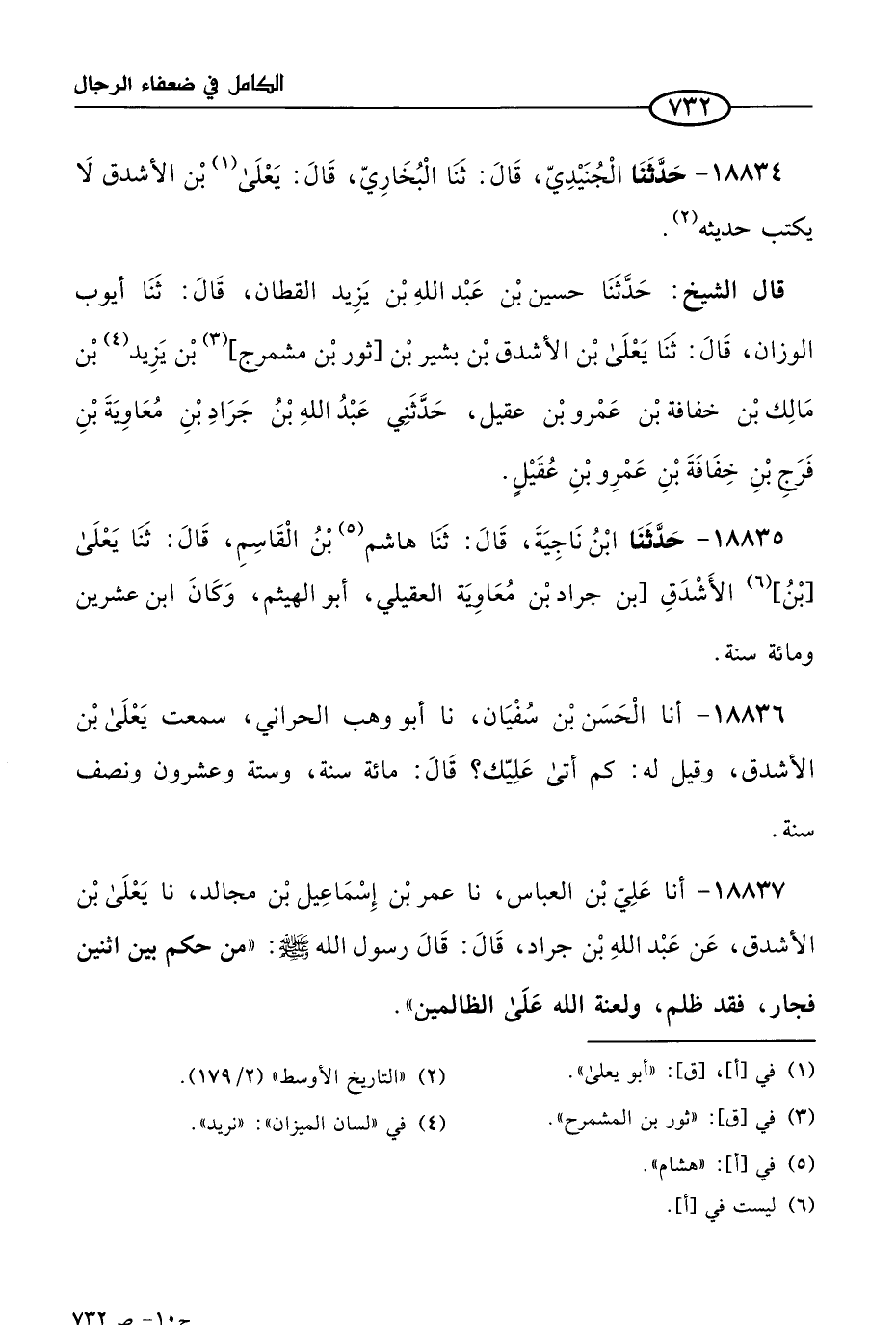 18834 - حَدثنا الجنيدي، قال: حَدثنا البُخاري قال: يعلَى بن الأشدق لا يكتَب حديثُهُ.
