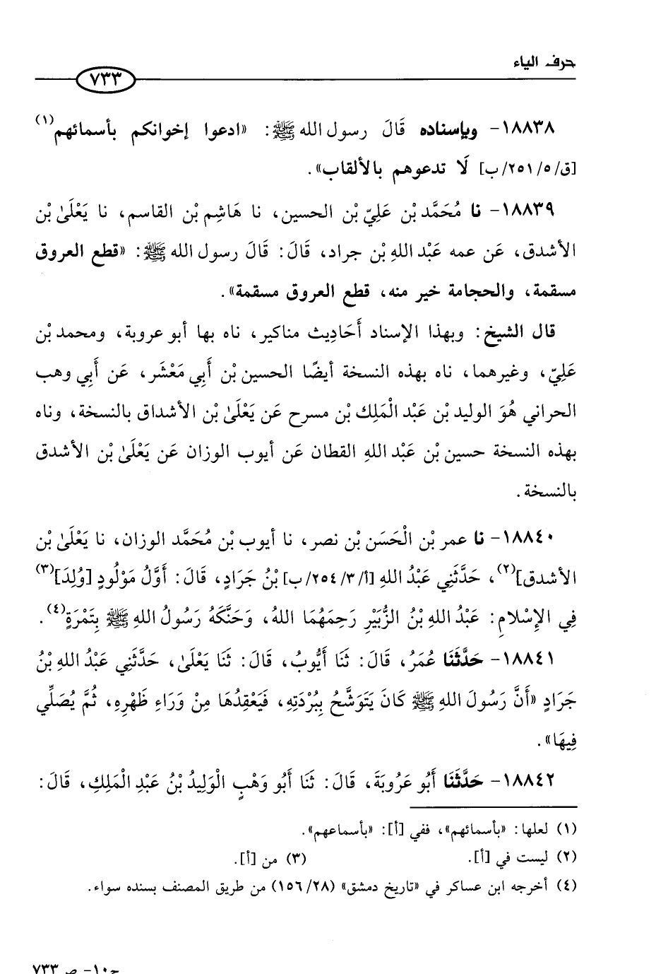 18838 - وبإسناده؛ قال رسول الله صَلى الله عَليه وسلم: ادعوا إخوانكم بأسمائهم، لاتدعوهم بالألقاب.