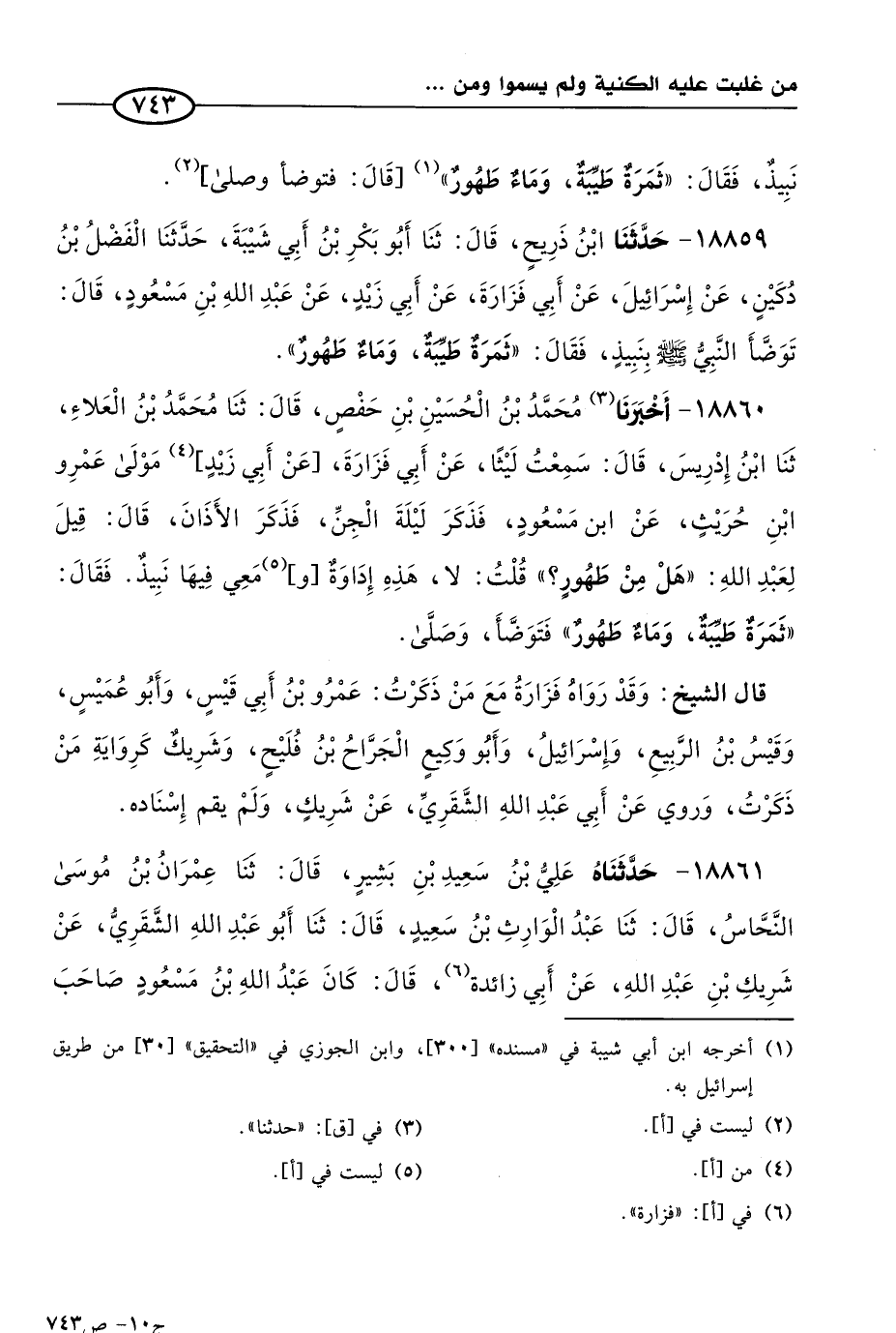 18859 - حَدثنا ابن ذريح، قال: حَدثنا أَبو بكر بن أبي شيبة، حَدثنا الفضل بن دكين، عن إسرائيل، عن أبي فزارة، عن أبي زيد، عن عَبد الله بن مسعود، قال: توضأ النبي صَلى الله عَليه وسلم بنبيذ، فقال: ثمرة طيبة وماء طهور.