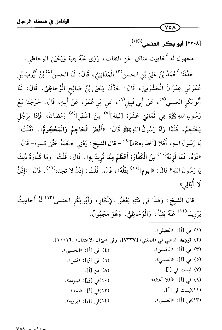 قال الشيخ: وهذا في متنه بعض الإنكار، وأَبو بكر العنسي له أحاديث يرويها عنه بقية والوحاظي، وهو مجهول.