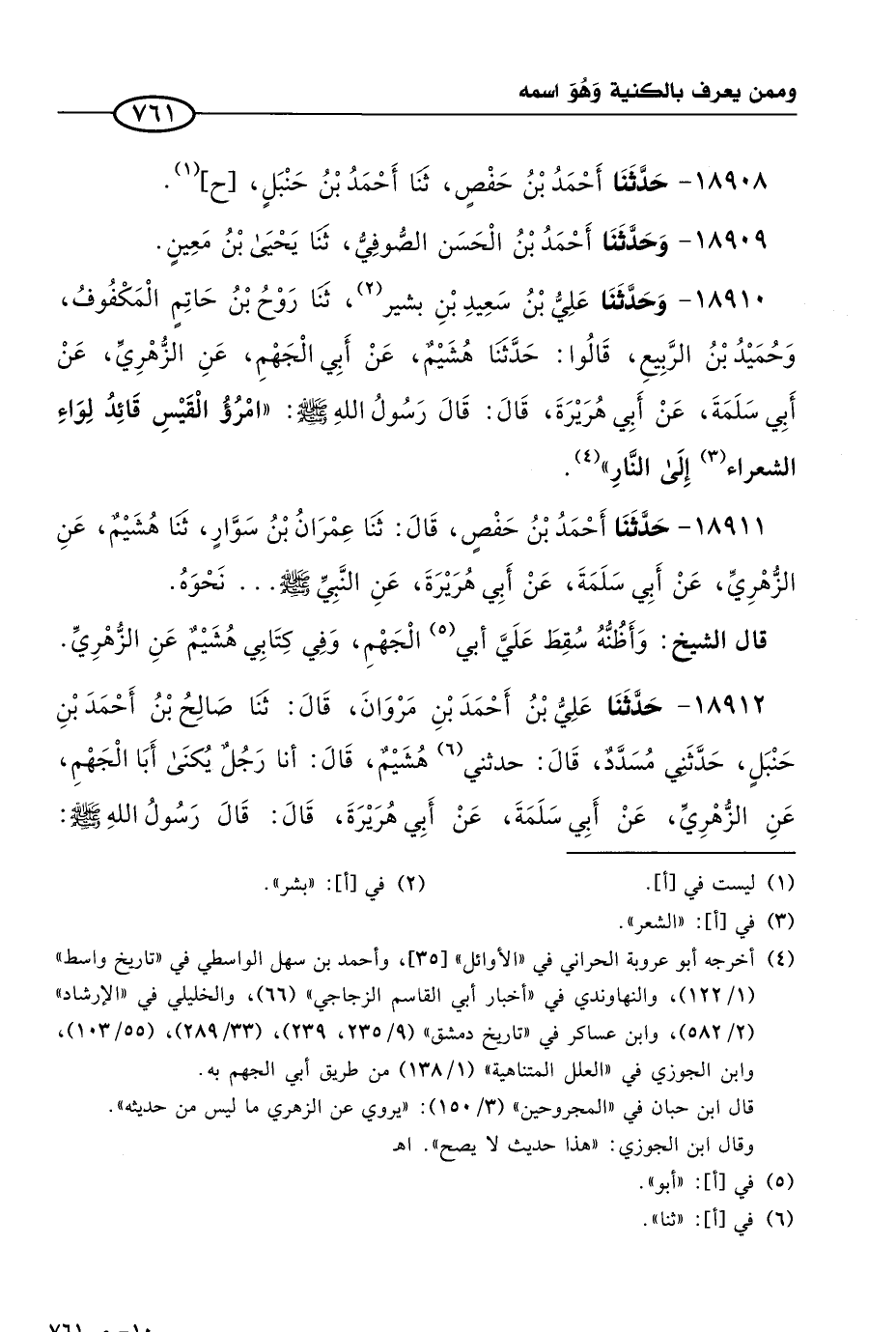 18912 - حَدثنا علي بن أحمد بن مروان، قال: حَدثنا صالح بن أحمد بن حنبل، حَدَّثني مُسَدَّد، قال: حَدثنا هشيم، قال: أخبرنا رجل، يكْنَى أبا الجهم، عن الزُّهْري، عن أبي سلمة، عن أبي هريرة، قال: قال رسول الله صَلى الله عَليه وسَلم: صاحب لواء الشعراء إلى النار يوم القيامة امرؤ القيس بن حجر الكندي، لأنه أول من أحكم الشعر.
