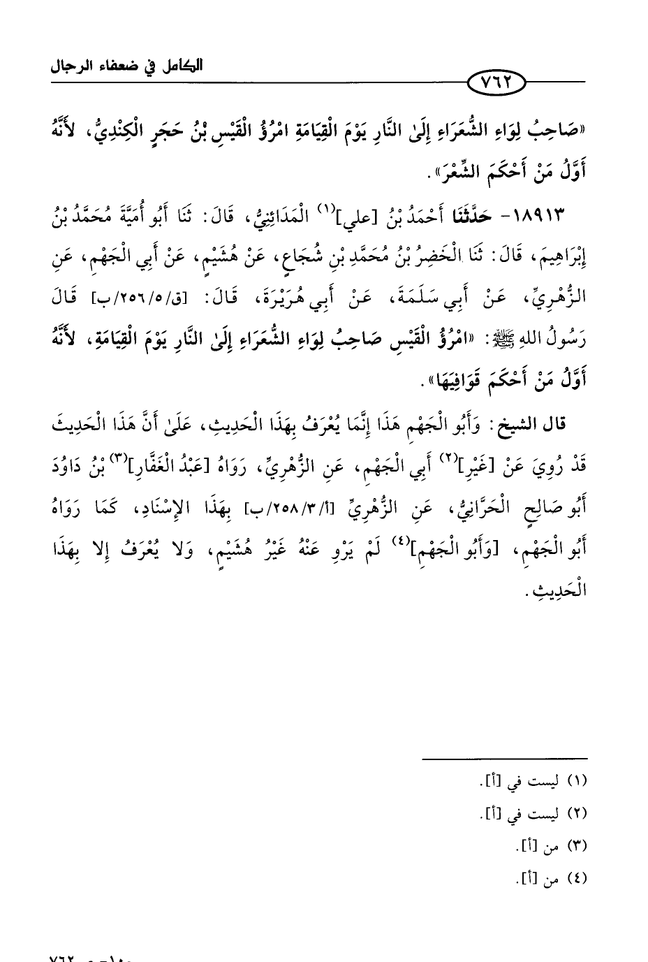 18913 - حَدثنا أحمد بن المدائني، قال: حَدثنا أَبو أمية مُحمد بن إبراهيم، قال: حَدثنا الخضر بن مُحمد بن شجاع، عن هشيم، عن أبي الجهم، عن الزُّهْري، عن أبي سلمة، عن أبي هريرة، قال: قال رسول الله صَلى الله عَليه وسَلم: امرؤ القيس صاحب لواء الشعراء إلى النار يوم القيامة، لأنه أول من أحكم قوافيها.
