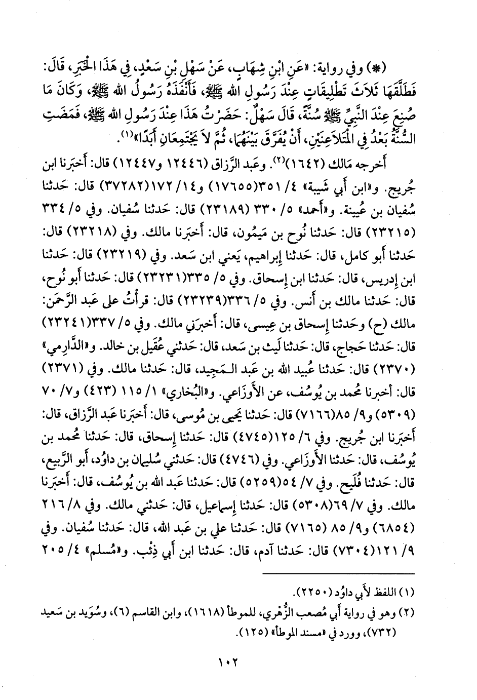 وفي ٧/ ٤٢ (٥٢٥٩) قال: حدثنا عبد الله بن يوسف، قال: أخبرنا مالك. وفي ٧/ ٥٣ (٥٣٠٨) قال: حدثنا إسماعيل، قال: حدثني مالك. وفي ٨/ ١٧٤ (٦٨٥٤) و ٩/ ٦٨ (٧١٦٥) قال: حدثنا علي بن عبد الله، قال: حدثنا سفيان. وفي ٩/ ٩٨ (٧٣٠٤) قال: حدثنا آدم، قال: حدثنا ابن أبي ذِئب. و «مسلم» ٤/ ٢٠٥