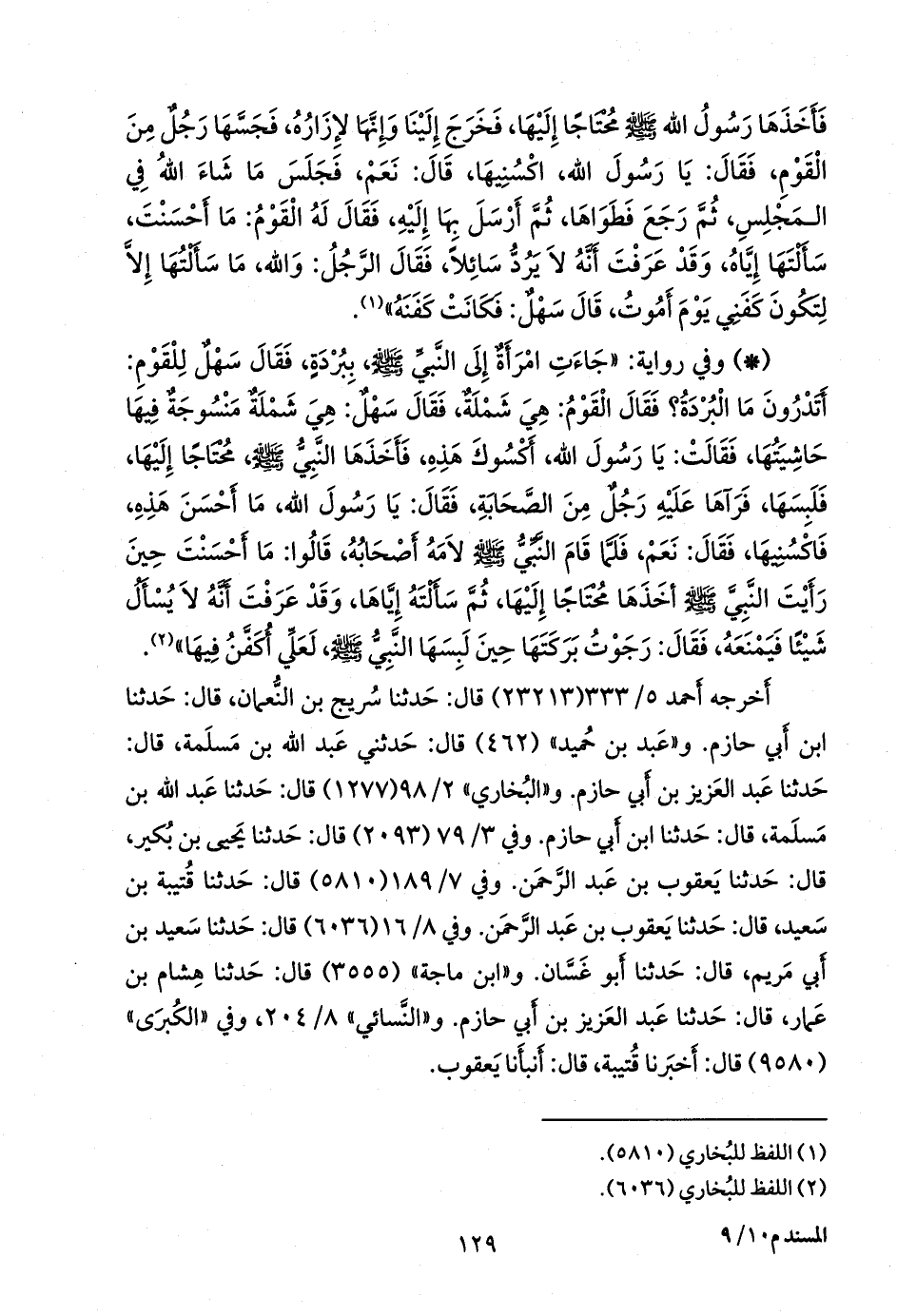 أخرجه أحمد (٢٣٢١٣) قال: حدثنا سريج بن النعمان، قال: حدثنا ابن أبي حازم. و «عَبد بن حُميد» (٤٦٢) قال: حدثني عبد الله بن مَسلَمة، قال: حدثنا عبد العزيز بن أبي حازم. و «البخاري» ٢/ ٧٨ (١٢٧٧) قال: حدثنا عبد الله بن مَسلَمة، قال: حدثنا ابن أبي حازم. وفي ٣/ ٦١ (٢٠٩٣) قال: حدثنا يحيى بن بُكير، قال: حدثنا يعقوب بن عبد الرَّحمَن. وفي ٧/ ١٤٦ (٥٨١٠) قال: حدثنا قتيبة بن سعيد، قال: حدثنا يعقوب بن عبد الرَّحمَن. وفي ٨/ ١٤ (٦٠٣٦) قال: حدثنا سعيد بن أبي مريم، قال: حدثنا أَبو غسان. و «ابن ماجة» (٣٥٥٥) قال: حدثنا هشام بن عمار، قال: حدثنا عبد العزيز بن أبي حازم. و «النَّسَائي» ٨/ ٢٠٤، وفي «الكبرى» (٩٥٨٠) قال: أخبرنا قتيبة، قال: أنبأنا يعقوب.
