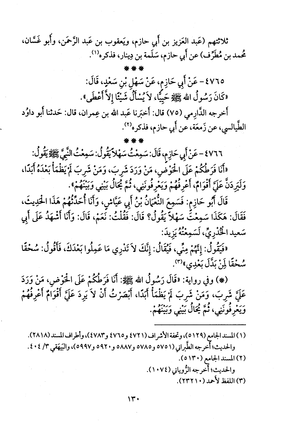 «أنا فرطكم على الحوض، من ورد شرب، ومن شرب لم يظمأ بعده أبدا، وليردن علي أقوام، أعرفهم ويعرفونني، ثم يحال بيني وبينهم».