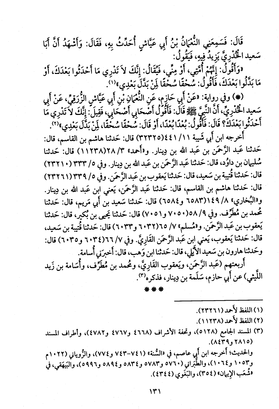 - وفي رواية: «عن أبي حازم، عن النعمان بن أبي عياش الزرقي، عن أبي سعيد الخُدْري، أن النبي صَلى الله عَليه وسَلم قال: فأقول أصحابي أصحابي، فقيل: إنك لا تدري ما أحدثوا بعدك؟ قال: فأقول: بعدا بعدا، أو قال: سحقا سحقا، لمن بدل بعدي» (¬١).