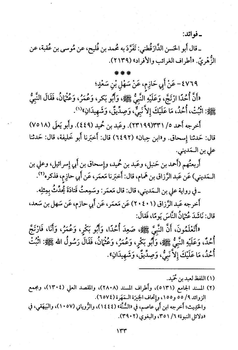 «أتعلمون، أن النبي صَلى الله عَليه وسَلم صعد أحدا، وأَبو بكر، وعمر، وأنا، فارتج أحد، وعليه النبي صَلى الله عَليه وسَلم وأَبو بكر، وعمر، وعثمان، فقال رسول الله صَلى الله عَليه وسَلم: اثبت أحد، ما عليك إلا نبي، وصديق، وشهيدان».