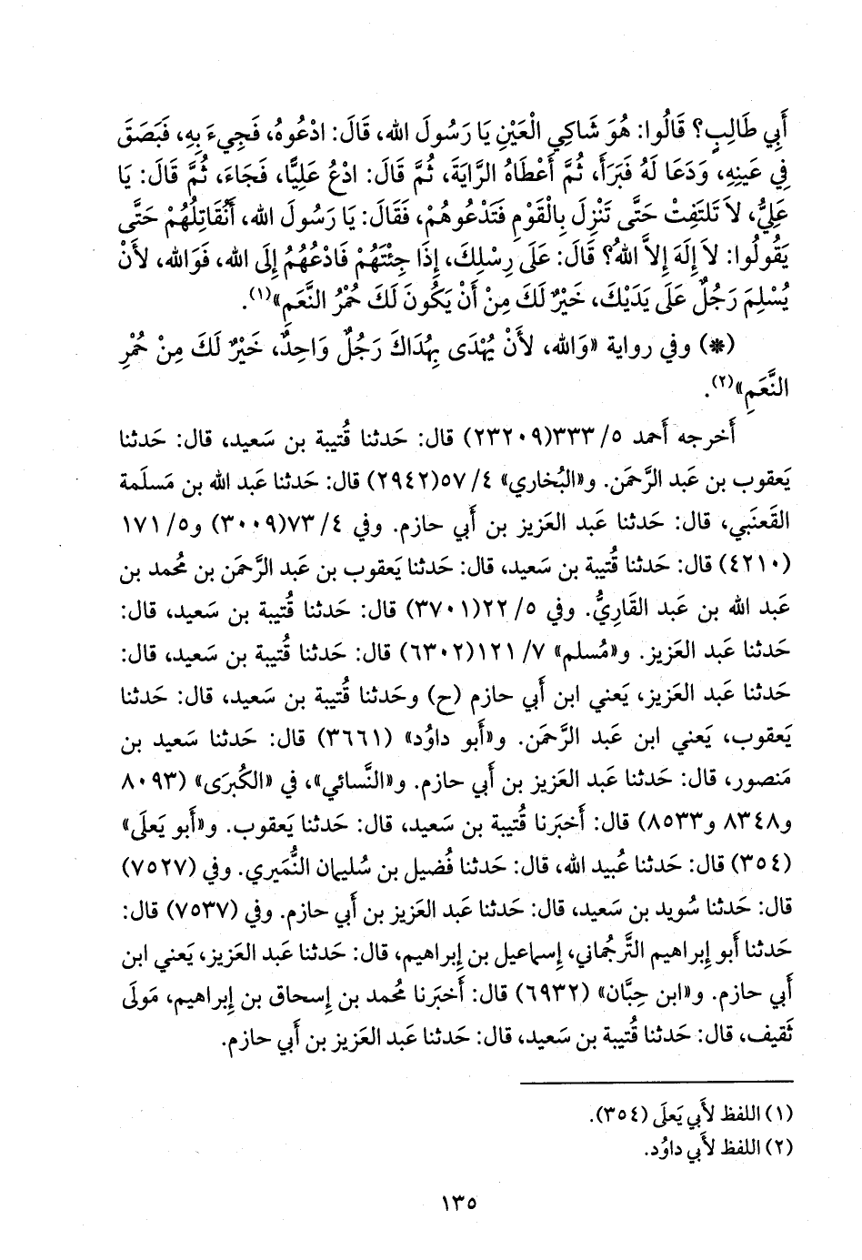 أخرجه أحمد (٢٣٢٠٩) قال: حدثنا قتيبة بن سعيد، قال: حدثنا يعقوب بن عبد الرَّحمَن. و «البخاري» ٤/ ٤٧ (٢٩٤٢) قال: حدثنا عبد الله بن مَسلَمة القَعنَبي، قال: حدثنا عبد العزيز بن أبي حازم. وفي ٤/ ٦٠ (٣٠٠٩) و ٥/ ١٣٤ (٤٢١٠) قال: حدثنا قتيبة بن سعيد، قال: حدثنا يعقوب بن عبد الرَّحمَن بن محمد بن عبد الله بن عبدٍ القَارِي. وفي ٥/ ١٨ (٣٧٠١) قال: حدثنا قتيبة بن سعيد، قال: حدثنا عبد العزيز. و «مسلم» ٧/ ١٢١ (٦٣٠٢) قال: حدثنا قتيبة بن سعيد، قال: حدثنا عبد العزيز، يعني ابن أبي حازم (ح) وحدثنا قتيبة بن سعيد، قال: حدثنا يعقوب، يعني ابن عبد الرَّحمَن. و «أَبو داود» (٣٦٦١) قال: حدثنا سعيد بن منصور، قال: حدثنا عبد العزيز بن أبي حازم. و «النَّسَائي» في «الكبرى» (٨٠٩٣ و ٨٣٤٨ و ٨٥٣٣) قال: أخبرنا قتيبة بن سعيد، قال: حدثنا يعقوب. و «أَبو يَعلى» (٣٥٤) قال: حدثنا عُبيد الله، قال: حدثنا فضيل بن سليمان النميري. وفي (٧٥٢٧) قال: حدثنا سويد بن سعيد، قال: حدثنا عبد العزيز بن أبي حازم. وفي (٧٥٣٧) قال: حدثنا أَبو إبراهيم التَّرجُماني، إسماعيل بن إبراهيم، قال: حدثنا عبد العزيز، يعني ابن أبي حازم. و «ابن حِبَّان» (٦٩٣٢) قال: أخبرنا محمد بن إسحاق بن إبراهيم مولى ثقيف، قال: حدثنا قتيبة بن سعيد، قال: حدثنا عبد العزيز بن أبي حازم.