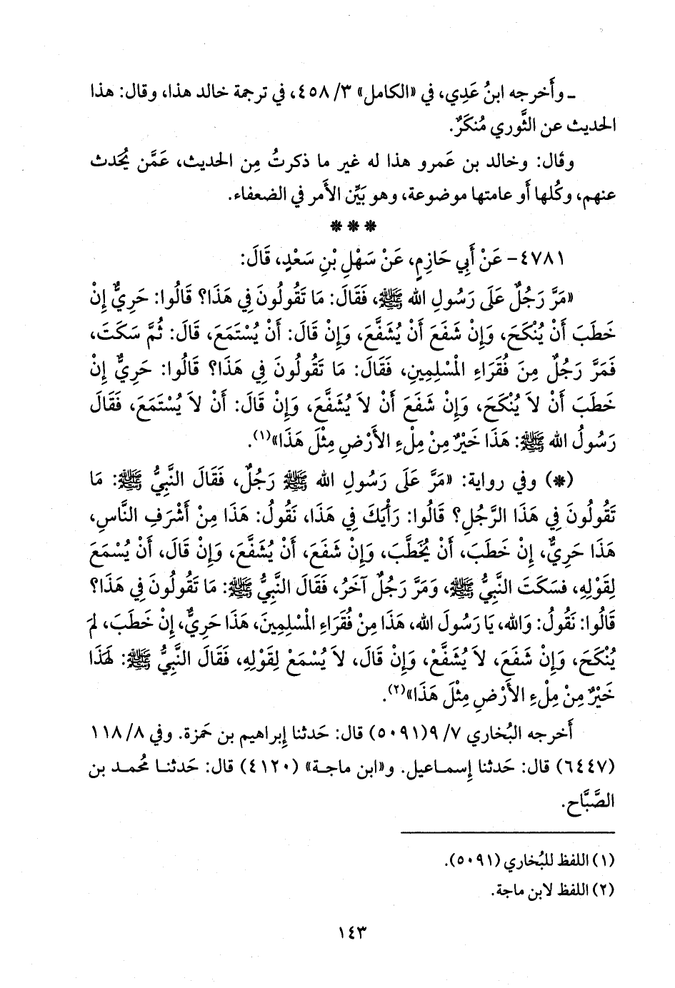 - وفي رواية: «مر على رسول الله صَلى الله عَليه وسَلم رجل، فقال النبي صَلى الله عَليه وسَلم: ما تقولون في هذا الرجل؟ قالوا: رأيك في هذا، نقول: هذا من أشرف الناس، هذا حري، إن خطب، أن يخطب، وإن شفع، أن يشفع، وإن قال، أن يسمع لقوله، فسكت النبي صَلى الله عَليه وسَلم ومر رجل آخر، فقال النبي صَلى الله عَليه وسَلم: ما تقولون في هذا؟ قالوا: نقول: والله، يا رسول الله، هذا من فقراء المسلمين، هذا حري، إن خطب، لم ينكح، وإن شفع، لا يشفع، وإن قال، لا يسمع لقوله، فقال النبي صَلى الله عَليه وسَلم: لهذا خير من ملء الأرض مثل هذا» (¬٢).
