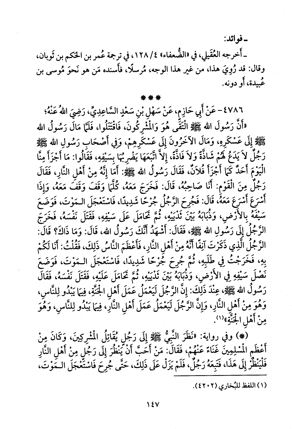 «أن رسول الله صَلى الله عَليه وسَلم التقى هو والمشركون، فاقتتلوا، فلما مال رسول الله صَلى الله عَليه وسَلم إلى عسكره، ومال الآخرون إلى عسكرهم، وفي أصحاب رسول الله صَلى الله عَليه وسَلم رجل لا يدع لهم شاذة ولا فاذة، إلا اتبعها يضربها بسيفه، فقالوا: ما أجزأ منا اليوم أحد كما أجزأ فلان، فقال رسول الله صَلى الله عَليه وسَلم: أما إنه من أهل النار، فقال رجل من القوم: أنا صاحبه، قال: فخرج معه، كلما وقف وقف معه، وإذا أسرع أسرع معه، قال: فجرح الرجل جرحا شديدا، فاستعجل الموت، فوضع سيفه بالأرض، وذبابه بين ثدييه، ثم تحامل على سيفه، فقتل نفسه، فخرج الرجل إلى رسول الله صَلى الله عَليه وسَلم فقال: أشهد أنك رسول الله، قال: وما ذاك؟ قال: الرجل الذي ذكرت آنفا أنه من أهل النار، فأعظم الناس ذلك، فقلت: أنا لكم به، فخرجت في طلبه، ثم جرح جرحا شديدا، فاستعجل الموت، فوضع نصل سيفه في الأرض، وذبابه بين ثدييه، ثم تحامل عليه، فقتل نفسه، فقال رسول الله صَلى الله عَليه وسَلم عند ذلك: إن الرجل ليعمل عمل أهل الجنة، فيما يبدو للناس، وهو من أهل النار، وإن الرجل ليعمل عمل أهل النار، فيما يبدو للناس، وهو من أهل الجنة» (¬١).