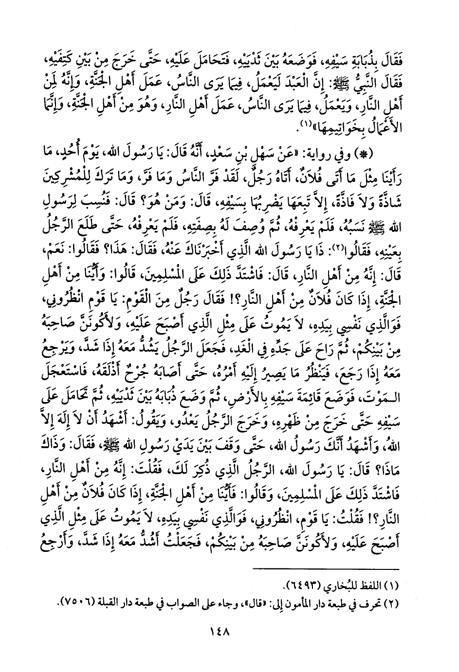 - وفي رواية: «عن سهل بن سعد، أنه قال: يا رسول الله، يوم أحد، ما رأينا مثل ما أتى فلان، أتاه رجل، لقد فر الناس وما فر، وما ترك للمشركين شاذة ولا فاذة، إلا تبعها يضربها بسيفه، قال: ومن هو؟ قال: فنسب لرسول الله صَلى الله عَليه وسَلم نسبه، فلم يعرفه، ثم وصف له بصفته، فلم يعرفه، حتى طلع الرجل بعينه، فقالوا (¬١): ذا يا رسول الله الذي أخبرناك عنه، فقال: هذا؟ فقالوا: نعم، قال: إنه من أهل النار، قال: فاشتد ذلك على المسلمين، قالوا: وأينا من أهل الجنة، إذا كان فلان من أهل النار؟! فقال رجل من القوم: يا قوم انظروني، فوالذي نفسي بيده، لا يموت على مثل الذي أصبح عليه، ولأكونن صاحبه من بينكم، ثم راح على جده في الغد، فجعل الرجل يشد معه إذا شد، ويرجع معه إذا رجع، فينظر ما يصير إليه أمره، حتى أصابه جرح أذلقه، فاستعجل الموت، فوضع قائمة سيفه بالأرض، ثم وضع ذبابه بين ثدييه، ثم تحامل على سيفه حتى خرج من ظهره، وخرج الرجل يعدو، ويقول: أشهد أن لا إله إلا الله، وأشهد أنك رسول الله، حتى وقف بين يدي رسول الله صَلى الله عَليه وسَلم فقال: وذاك ماذا؟ قال: يا رسول الله، الرجل الذي ذكر لك، فقلت: إنه من أهل النار، فاشتد ذلك على المسلمين، وقالوا: فأينا من أهل الجنة، إذا كان فلان من أهل النار؟! فقلت: يا قوم، انظروني، فوالذي نفسي بيده، لا يموت على مثل الذي أصبح عليه، ولأكونن صاحبه من بينكم، فجعلت أشد معه إذا شد، وأرجع