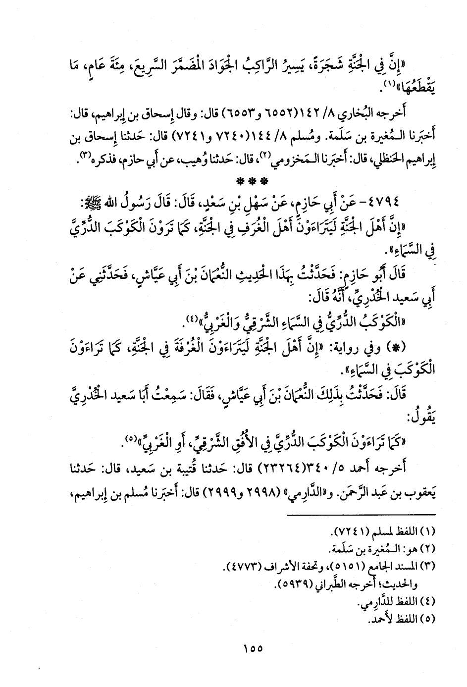- وفي رواية: «إن أهل الجنة ليتراءون الغرفة في الجنة، كما تراءون الكوكب في السماء».