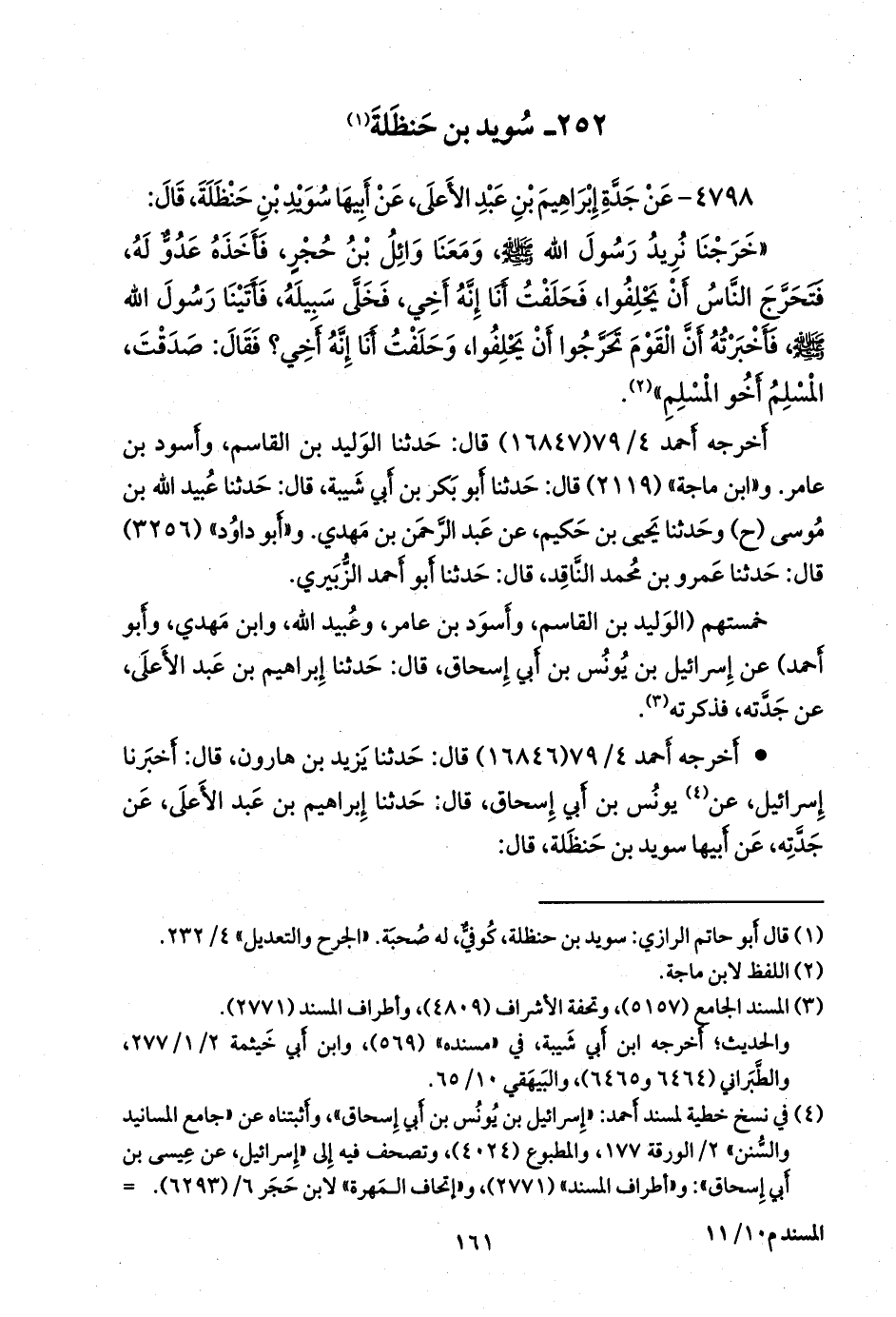 - وقال أَبو نُعيم: حدثنا أَبو بكر بن مالك (هو القطيعي راوي «المسند»)، قال: حدثنا عبد الله بن أحمد بن حنبل، قال: حدثني أبي، قال: حدثنا يزيد بن هارون، قال: أخبرنا إسرائيل، عن يونس بن أبي إسحاق، عن إبراهيم بن عبد الأعلى، عن جدته، عن أبيها سويد بن حنظلة، قال: خرجنا، فذكره. «معرفة الصحابة» (٣٥٣٠).