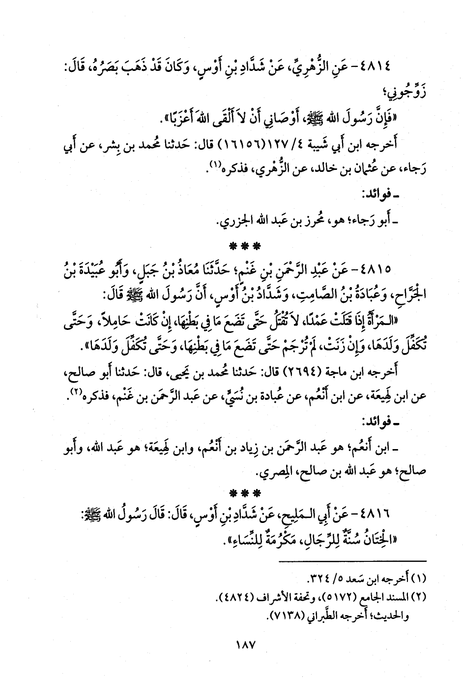 ٤٨١٥ - عن عبد الرَّحمَن بن غَنْم؛ حدثنا معاذ بن جبل، وأَبو عُبَيدة بن الجَراح، وعبادة بن الصامت، وشداد بن أوس، أن رسول الله صَلى الله عَليه وسَلم قال: