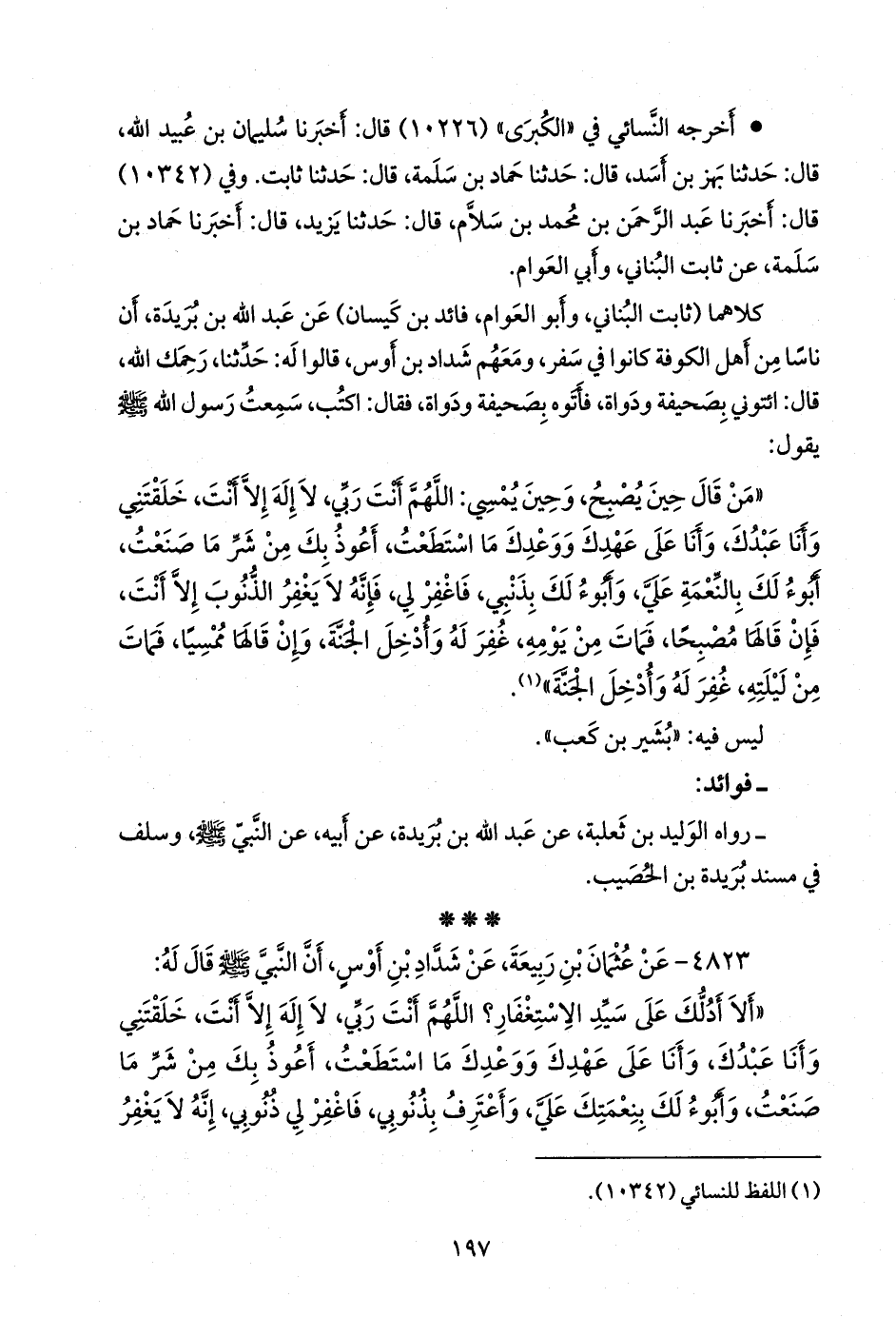 «ألا أدلك على سيد الاستغفار؟ اللهم أنت ربي، لا إله إلا أنت، خلقتني وأنا عبدك، وأنا على عهدك ووعدك ما استطعت، أعوذ بك من شر ما صنعت، وأَبوء لك بنعمتك علي، وأعترف بذنوبي، فاغفر لي ذنوبي، إنه لا يغفر