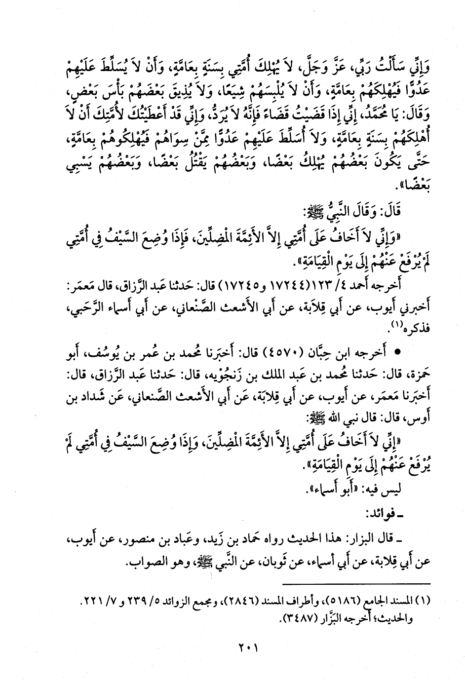 - قال البزار: هذا الحديث رواه حماد بن زيد، وعباد بن منصور، عن أيوب، عن أبي قلابة، عن أبي أسماء، عن ثوبان، عن النبي صَلى الله عَليه وسَلم وهو الصواب.