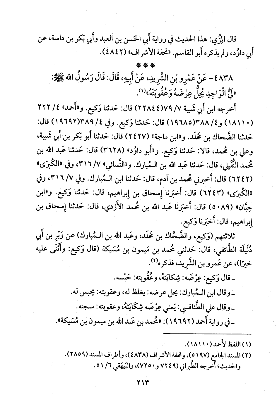 ثلاثتهم (وكيع، والضحاك بن مخلد، وعبد الله بن المبارك) عن وَبْر بن أبي دُلَيلة الطائفي، قال: حدثني محمد بن ميمون بن مسيكة (قال وكيع: وأثنى عليه خيرا)، عن عَمرو بن الشريد، فذكره (¬٢).