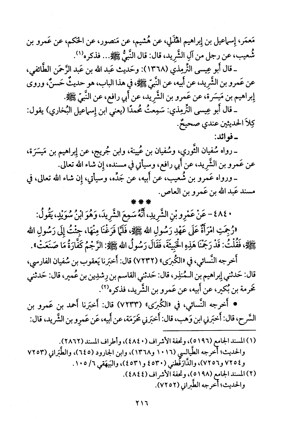 - قال أَبو عبد الرَّحمَن النَّسَائي: ليس لعَمرو بن الشريد صحبة، والقاسم بن رِشْدِين لا أعرفه، ويشبه أن يكون مدنيا، ومَخرَمة بن بُكير بن عبد الله بن الأشج لم يسمع من أبيه.