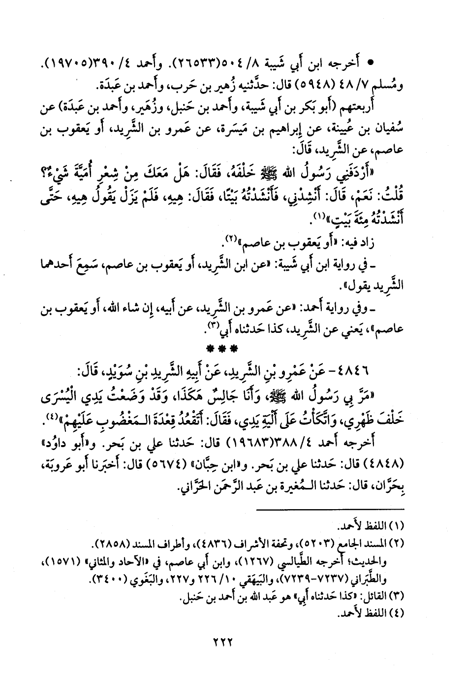 - وفي رواية أحمد: «عن عَمرو بن الشريد، عن أبيه، إن شاء الله، أو يعقوب بن عاصم»، يعني عن الشريد، كذا حدثناه أبي (¬٣).