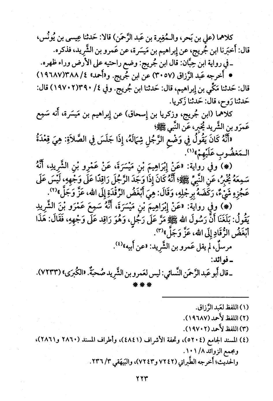 - قال أَبو عبد الرَّحمَن النَّسَائي: ليس لعَمرو بن الشريد صحبة. «الكبرى» (٧٢٣٣).