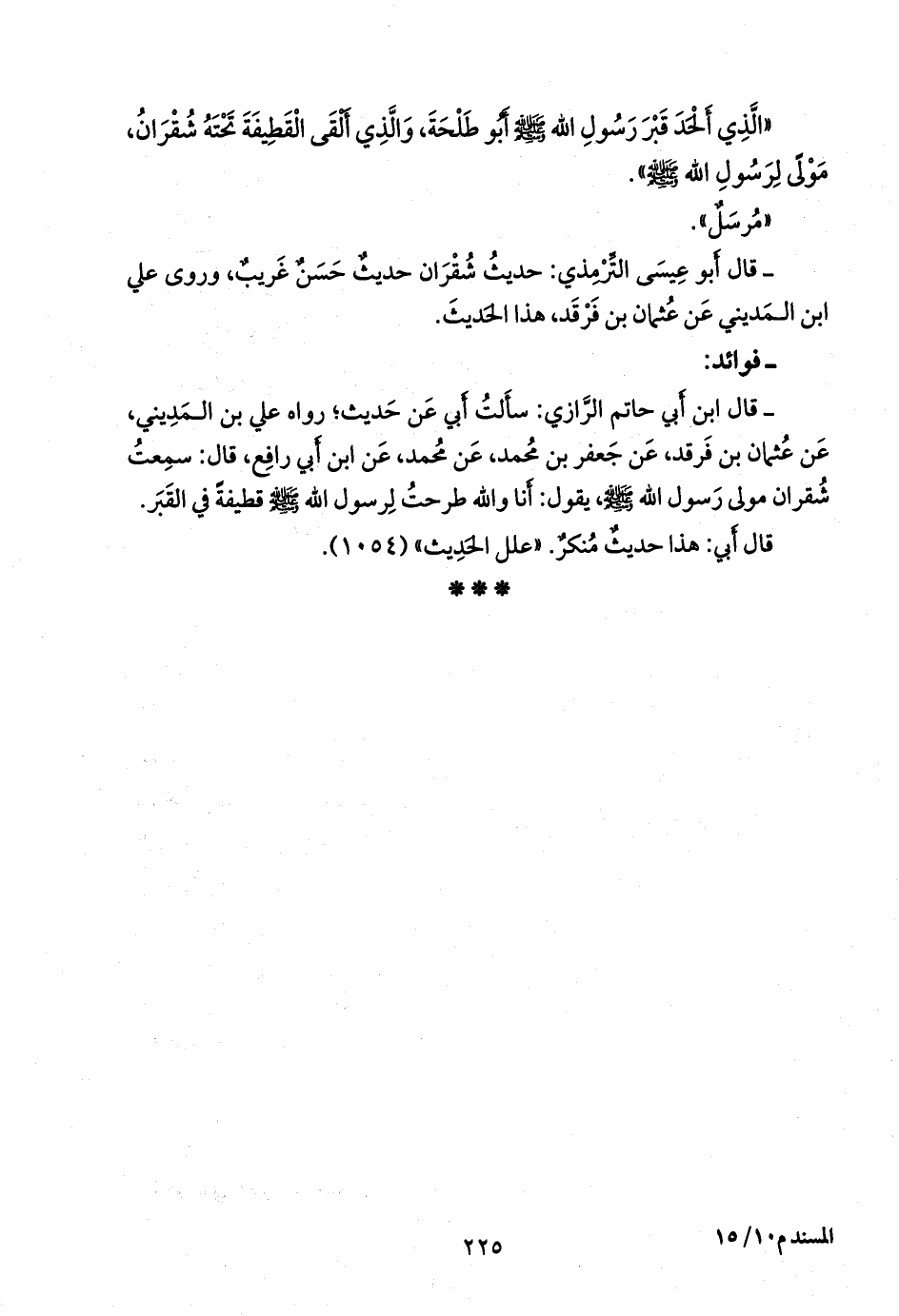 - قلنا: إِسناده ضعيفٌ؛ قال ابن أبي حاتم الرازي: سألتُ أبي عن حديثٍ؛ رواه علي بن المديني، عن عثمان بن فرقد، عن جعفر بن محمد، عن محمد، عن ابن أبي رافع، قال: سمعت شقران مولى رسول الله صَلى الله عَليه وسَلم يقول: أنا والله طرحت لرسول الله صَلى الله عَليه وسَلم قطيفة في القبر.