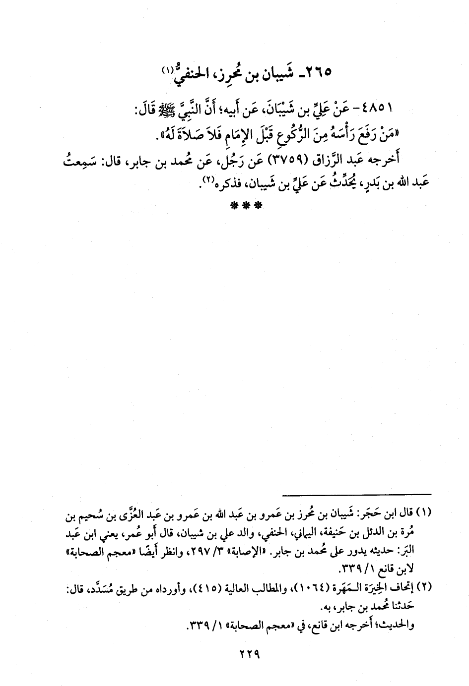 أخرجه عبد الرزاق (٣٧٥٩) عن رجل، عن محمد بن جابر، قال: سمعت عبد الله بن بدر، يحدث عن علي بن شَيبان، فذكره (¬٢).