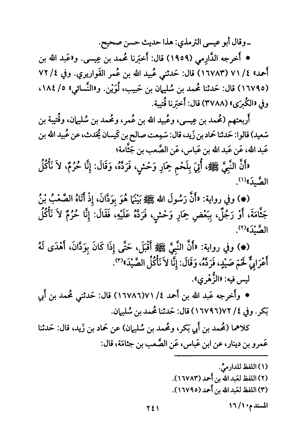 أربعتهم (محمد بن عيسى، وعُبيد الله بن عمر، ومحمد بن سليمان، وقتيبة بن سعيد) عن حماد بن زيد، قال: سمعت صالح بن كيسان يحدث، عن عُبيد الله بن عبد الله، عن عبد الله بن عباس، عن الصعب بن جثامة؛