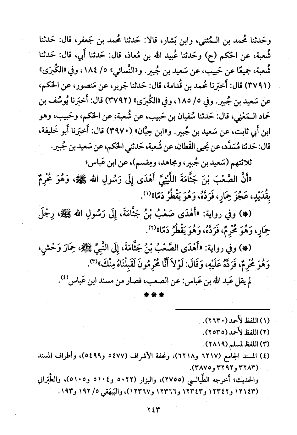 - وفي رواية: «أهدى صعب بن جثامة، إلى رسول الله صَلى الله عَليه وسَلم رجل حمار، وهو محرم، فرده، وهو يقطر دما» (¬٢).