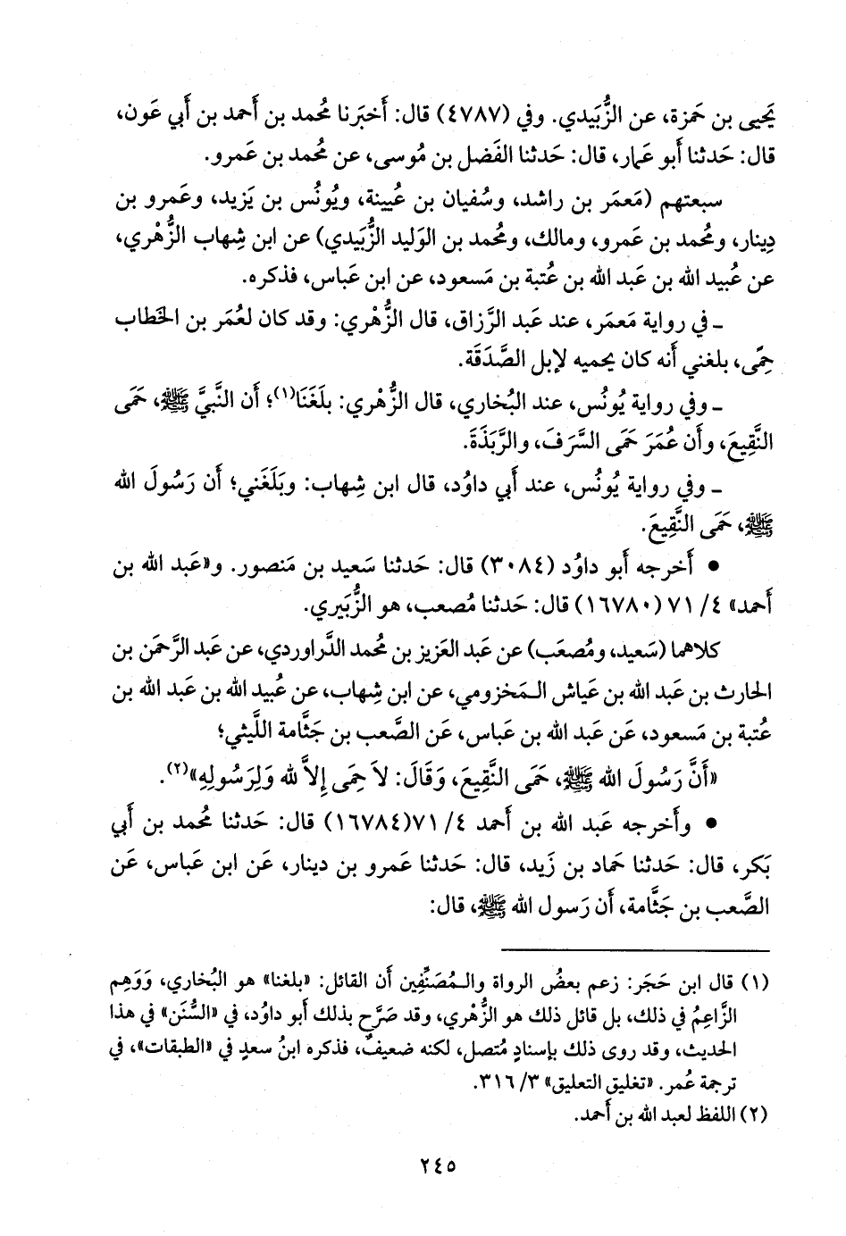 كلاهما (سعيد، ومصعب) عن عبد العزيز بن محمد الدراوَرْدي، عن عبد الرَّحمَن بن الحارث بن عبد الله بن عياش المخزومي، عن ابن شهاب، عن عُبيد الله بن عبد الله بن عُتبة بن مسعود، عن عبد الله بن عباس، عن الصعب بن جثامة الليثي؛