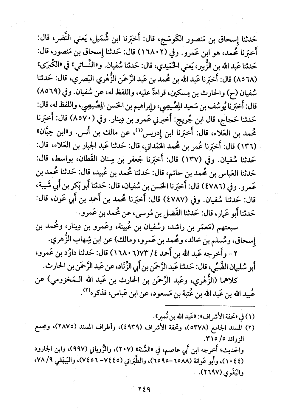 وفي (١٦٨٠٢) قال: حدثنا إسحاق بن منصور، قال: حدثنا عبد الله بن الزبير، يعني الحميدي، قال: حدثنا سفيان. و «النَّسَائي» في «الكبرى» (٨٥٦٨) قال: أخبرنا عبد الله بن محمد بن عبد الرَّحمَن الزُّهْري البصري، قال: حدثنا سفيان (ح) والحارث بن مسكين، قراءة عليه, واللفظ له، عن سفيان. وفي (٨٥٦٩) قال: أخبرنا يوسف بن سعيد المصيصي، وإبراهيم بن الحسن المصيصي، واللفظ له، قال: حدثنا حجاج، قال ابن جُريج: أخبرني عَمرو بن دينار. وفي (٨٥٧٠) قال: أخبرنا محمد بن العلاء، قال: أخبرنا ابن إدريس (¬١)، عن مالك بن أنس. و «ابن حِبَّان» (١٣٦) قال: أخبرنا عمر بن محمد الهمداني، قال: حدثنا عبد الجبار بن العلاء، قال: حدثنا سفيان. وفي (١٣٧) قال: أخبرنا جعفر بن سنان القطان، بواسط، قال: حدثنا العباس بن محمد بن حاتم، قال: حدثنا محمد بن عبيد، قال: حدثنا محمد بن عَمرو. وفي (٤٧٨٦) قال: أخبرنا الحسن بن سفيان، قال: حدثنا أَبو بكر بن أبي شيبة، قال: حدثنا سفيان. وفي (٤٧٨٧) قال: أخبرنا محمد بن أحمد بن أبي عون، قال: حدثنا أَبو عمار، قال: حدثنا الفضل بن موسى، عن محمد بن عَمرو.