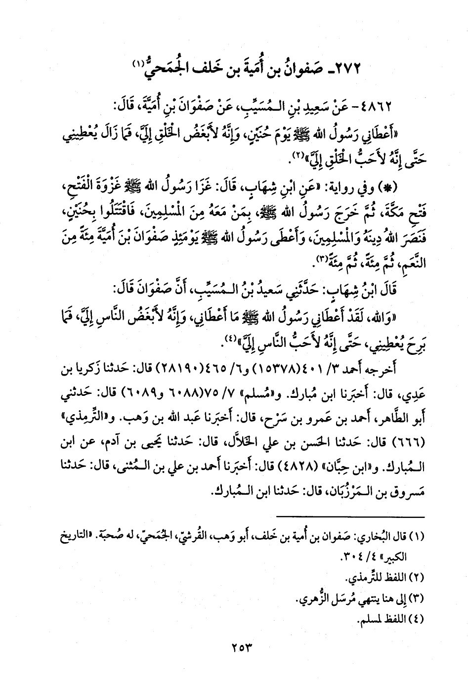 - قال التِّرمِذي: حديث صفوان، رواه معمر، وغيره، عن الزُّهْري، عن سعيد بن المُسَيب، أن صفوان بن أُمية قال: «أعطاني رسول الله صَلى الله عَليه وسَلم»، وكأن هذا الحديث أصح وأشبه، إنما هو سعيد بن المُسَيب، أن صفوان.