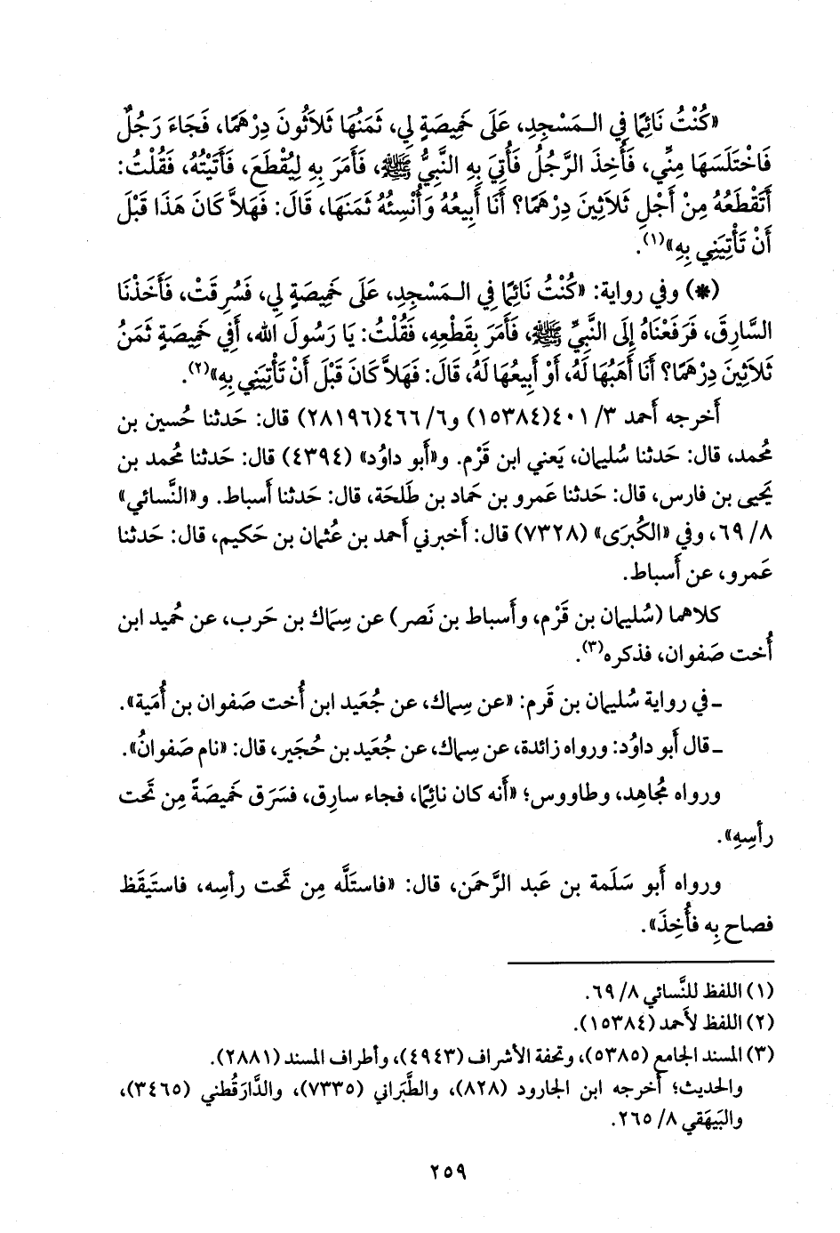 ورواه الزُّهْري، عن صفوان بن عبد الله، قال: فنام في المسجد، وتوسد رداءه، فجاء سارق فأخذ رداءه، فأخذ السارق، فجاء به إلى النبي صَلى الله عَليه وسَلم.