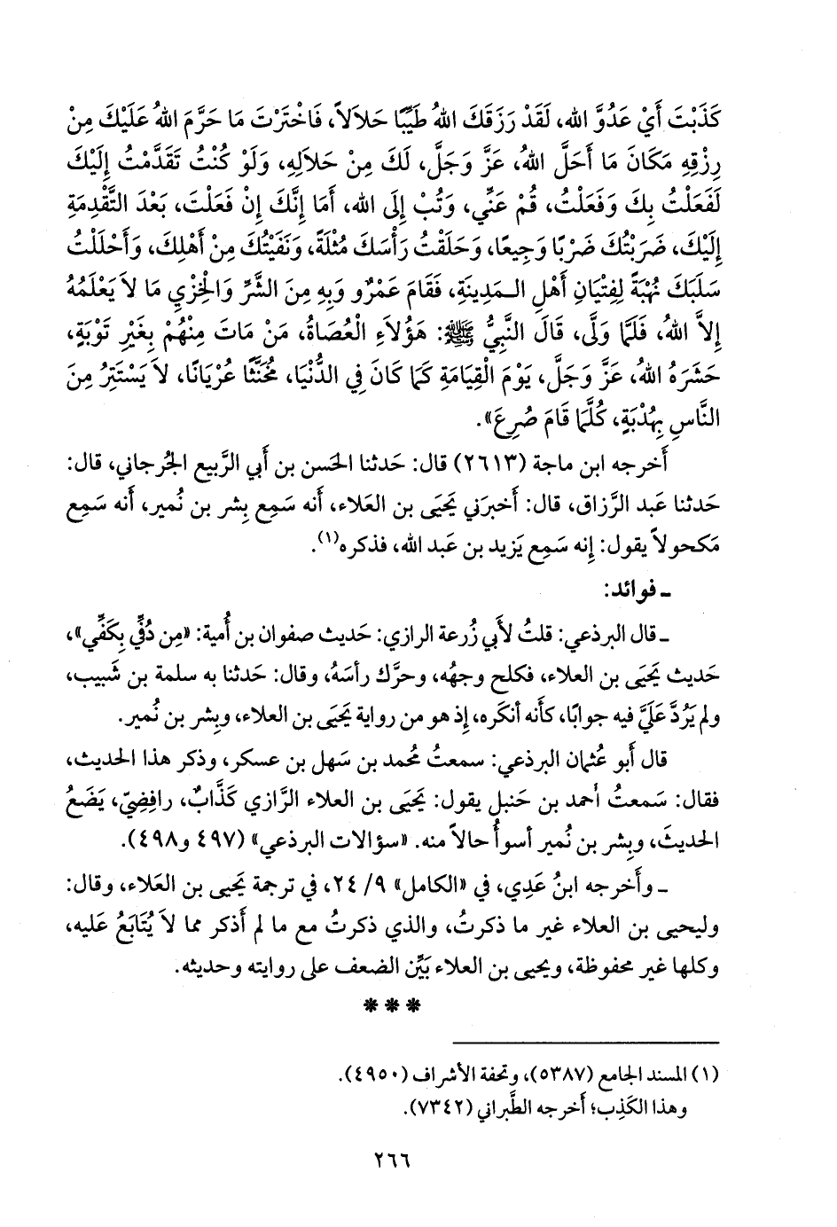 - وقال البرذعي: قلت لأَبي زُرعَة الرازي: حديث صفوان بن أُمية: «من دفي بكفي»، حديث يحيى بن العلاء، فكلح وجهه، وحرك رأسه، وقال: حدثنا به سلمة بن شبيب، ولم يرد علي فيه جوابا، كأنه أنكره، إذ هو من رواية يحيى بن العلاء، وبشر بن نُمير.