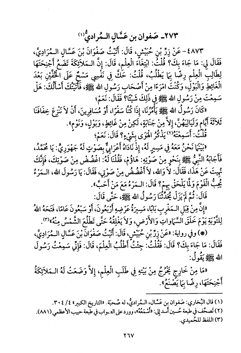 ٤٨٧٣ - عن زِرّ بن حُبَيش، قال: أتيت صفوان بن عسال المرادي، فقال لي: ما جاء بك؟ قلت: ابتغاء العلم، قال: إن الملائكة تضع أجنحتها لطالب العلم رضا بما يطلب، قلت: حك في نفسي مسح على الخفين بعد الغائط والبول، وكنت امرءا من أصحاب رسول الله صَلى الله عَليه وسَلم فأتيتك أسألك: هل سمعتَ من رسول الله صَلى الله عَليه وسَلم في ذلك شيئا؟ فقال: نعم؛