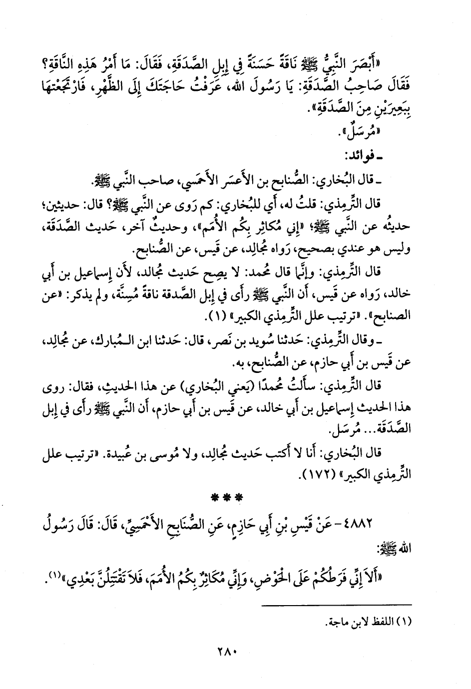 قال التِّرمِذي: وإنما قال محمد: لا يصح حديث مجالد، لأن إسماعيل بن أبي خالد، رواه عن قيس، أن النبي صَلى الله عَليه وسَلم رأى في إبل الصدقة ناقة مسنة، ولم يذكر: «عن الصنابح». «ترتيب علل التِّرمِذي الكبير» (١).