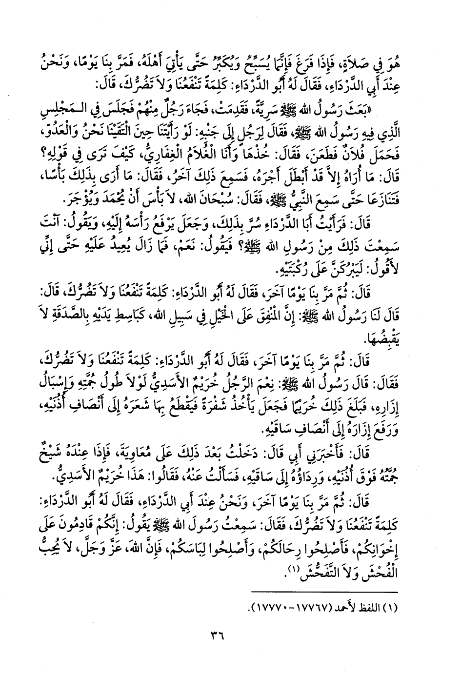 قال: ثم مر بنا يوما آخر، ونحن عند أبي الدرداء، فقال له أَبو الدرداء: كلمة تنفعنا ولا تضرك، فقال: سمعت رسول الله صَلى الله عَليه وسَلم يقول: إنكم قادمون على إخوانكم، فأصلحوا رحالكم، وأصلحوا لباسكم، فإن الله، عز وجل، لا يحب الفحش ولا التفحش (¬١).