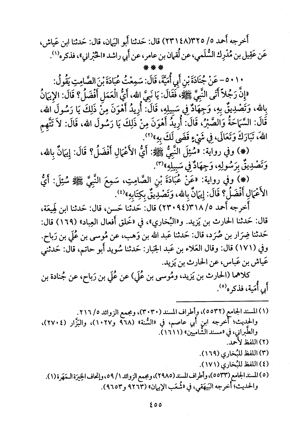 - وفي رواية: «عن عبادة بن الصامت، سمع النبي صَلى الله عَليه وسَلم سئل: أي الأعمال أفضل؟ قال: إيمان بالله، وتصديق بكتابه» (¬٣).