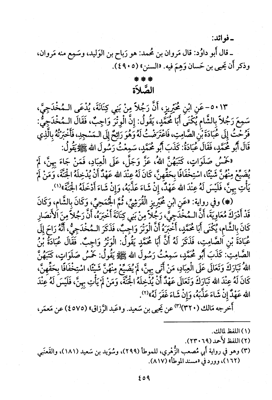 - وفي رواية: «عن ابن محيريز القرشي، ثم الجُمحي، وكان بالشام، وكان قد أدرك معاوية، أن المُخدَجي، رجلا من بني كنانة أخبره، أن رجلا من الأنصار كان بالشام، يكنى أبا محمد، أخبره أن الوتر واجب، فذكر المُخدَجي، أنه راح إلى عبادة بن الصامت، فذكر له أن أبا محمد يقول: الوتر واجب. فقال عبادة بن الصامت: كذب أَبو محمد، سمعت رسول الله صَلى الله عَليه وسَلم يقول: خمس صلوات، كتبهن الله تبارك وتعالى على العباد، من أتى بهن، لم يضيع منهن شيئا، استخفافا بحقهن، كان له عند الله تبارك وتعالى عهد أن يدخله الجنة، ومن لم يأت بهن، فليس له عند الله عهد إن شاء عذبه، وإن شاء غفر له» (¬٢).